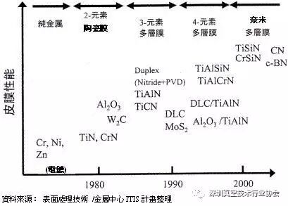 覆膜刀具的出現(xiàn)是刀具材料發(fā)展中的一次改變,采用鍍膜技術(shù)可有效提高切削刀具使用壽命,使刀具獲得優(yōu)良的整體機(jī)械性能,從而大幅度提高機(jī)械加工效率。因此,工業(yè)先進(jìn)國家使用的覆膜刀具在切削刀具中占的比例越來越大,約達(dá)70%~80%的比重。【圖1】所示為刀具鍍膜的發(fā)展歷程,從一代的單一膜層逐漸發(fā)展到多元多層膜層,以滿足不同材料及切削環(huán)境的切削加工。