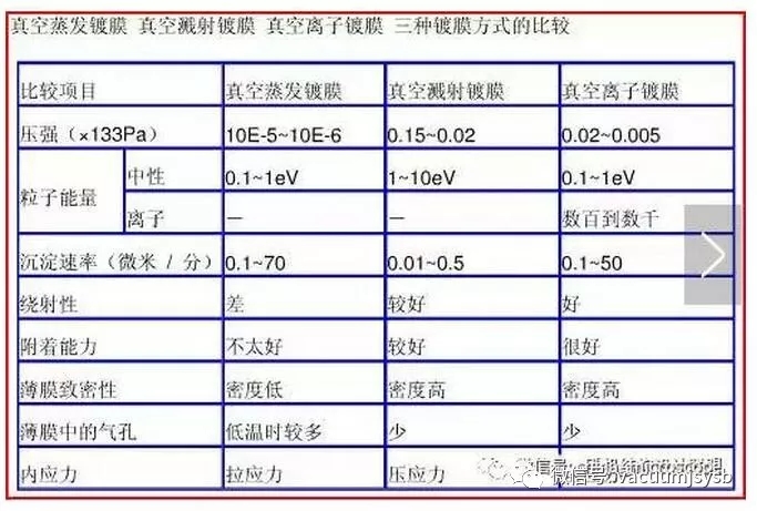 五、PVD (Physical Vapor Deposition) 分為:真空蒸發(fā)鍍膜、真空濺射鍍膜和真空離子鍍膜。我們通常所說的PVD鍍膜 ,指的就是真空離子鍍膜;通常說的NCVM鍍膜,就是指真空蒸發(fā)鍍膜和真空濺射鍍。