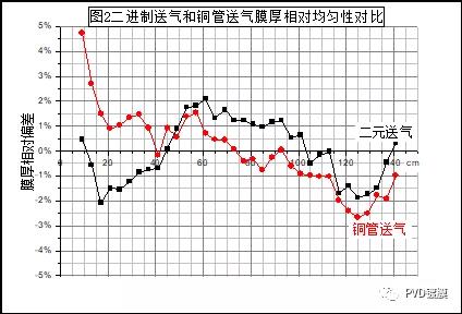 其2中,銅管送氣是氣體從銅管的一端進(jìn)入,從銅管上均勻開的多個小孔流出進(jìn)入真空室,由于從進(jìn)氣端到末端氣體被小孔流出形成壓強(qiáng)漸小,小孔流出的氣體也逐漸減少,形成不均勻送氣;二進(jìn)制送氣是將氣體均勻的一路分為二路,二路均分為四路,如此均分為多路后送入真空室,可認(rèn)為是均勻送氣。觀察對比圖中曲線可知二進(jìn)制送氣情況下,影響膜厚不均勻的主要是磁場,銅管送氣的情況下,膜厚的分布,在磁場影響的基礎(chǔ)上,疊加了一個斜率。這個斜率,正好和銅管送氣產(chǎn)生的壓強(qiáng)梯度相符。壓強(qiáng)大的地方,膜較厚,相反較薄。根據(jù)形成不均勻送氣的原理可以推知,膜層厚度的變化斜率可能和小孔的密度,大小和送氣壓力有關(guān),基本關(guān)系大概是和小孔密度、大小成正比,和送氣壓力成反比。