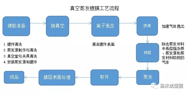 鍍前準(zhǔn)備→抽真空→離子轟擊→烘烤→預(yù)熔→蒸發(fā)→取件→膜層表面處理→成品