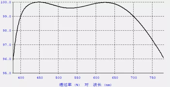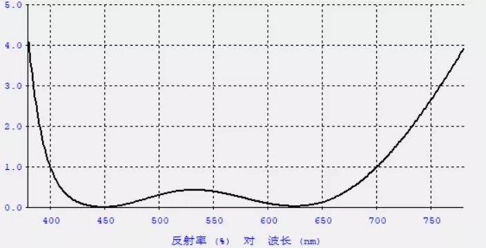 例如,在玻璃基底上交替鍍氧化鈦和氧化硅,共鍍六層,當(dāng)我們通過對六層膜厚度的設(shè)計(jì)可達(dá)到其對可見光400-700nm光波的反射率小于1%,此時其透過率會相應(yīng)增加,如下圖所示: