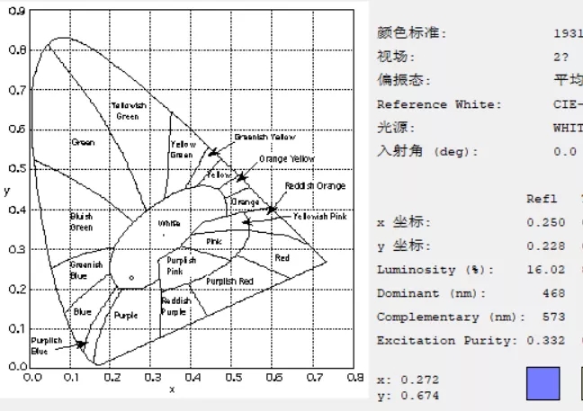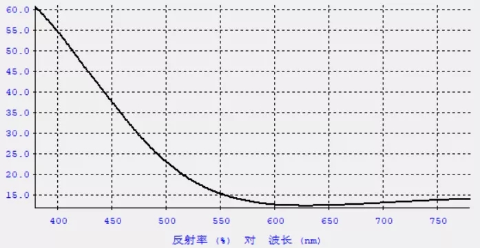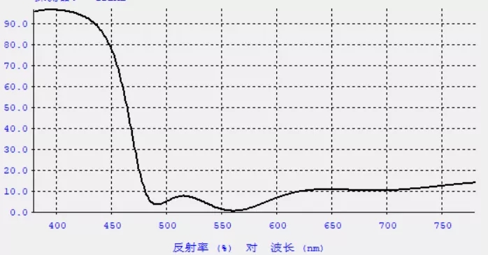 例如,下圖為為某款產(chǎn)品設(shè)計(jì)的顏色膜反射率曲線,可以看到其在400-500nm藍(lán)紫光波長范圍的反射率很高,而在500-700波長的其他可見光范圍反射率很低,于此可見此款顏色膜主要反射的是藍(lán)紫光,即產(chǎn)品外觀呈現(xiàn)藍(lán)紫色。