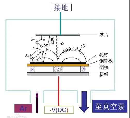 原理:磁控濺射是在真空室內加入正交(有例外)的電磁場,空間中的電子在電磁場的作用下不斷做螺旋線運動,電子運動撞擊空間中稀有氣體粒子(一般氮氣、氬氣),使其離化,離化了的粒子又會產生運動著的電子,繼續(xù)撞擊其他稀有氣體粒子,于是電子越來越多,形成電子云環(huán)繞在陽離子周圍,構成等離子體,陽離子在電場力的作用下作用下轟擊靶材(靶材接負壓),濺射出靶材離子,在基片上沉積。