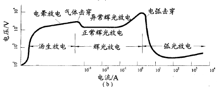使真空容器中Ar氣的壓力保持一定,并逐漸提高兩個電極之間的電壓。在開始時,電極之間幾乎沒有電流通過,因為這時氣體原子大多仍處于中性狀態(tài),只有極少量的電離粒子在電場的作用下做定向運動,形成極為微弱的電流,即圖(b)中曲線的開始階段所示的那樣。