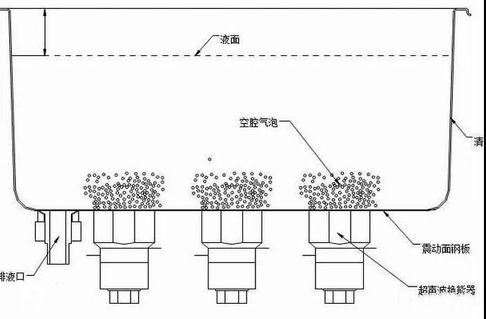 超聲波是一種頻率超出人類聽覺范圍20 kHz以上的聲波。超聲波的傳播要依靠彈性介質(zhì),其傳播時,使彈性介質(zhì)中的粒子振蕩,并通過介質(zhì)按超聲波的傳播方向傳遞能量,這種波可分為縱向波和橫向波。在固體內(nèi),兩者都可以傳送,而在氣體和液體內(nèi),只有縱向波可以傳送。超聲波能夠引起質(zhì)點振動,質(zhì)點振動的加速度與超聲頻率的平方成正比。因此,幾十千赫茲的超聲會產(chǎn)生極大的作用力,強超聲波在液體中傳播時,由于非線性作用,會產(chǎn)生聲空化。在空化氣泡突然閉合時發(fā)出的沖擊波可在其周圍產(chǎn)生上千個大氣壓力,對污層的直接反復(fù)沖擊,一方面破壞污物與清洗件表面的吸附,另一方面也會引起污物層的破壞而脫離清洗件表面并使它們分散到清洗液中。氣泡的振動也能對固體表面進行擦洗。氣泡還能“鉆入”裂縫中做振動,使污物脫落。對于有油脂性污物,由于超聲空化作用,兩種液體在界面迅速分散而乳化,當固體粒子被油污裹著而粘附在清洗件表面時,油被乳化,固體粒子即脫落??栈瘹馀菰谡駝舆^程中會使液體本身產(chǎn)生環(huán)流,即所謂聲流。他可使振動氣泡表面存在很高的速度梯度和粘滯應(yīng)力,促使清洗件表面污物的破壞和脫落,超聲空化在固體和液體表面上所產(chǎn)生的高速微射流能夠除去或削弱邊界污層,腐蝕固體表面,增加攪拌作用,加速可溶性污物的溶解,強化化學(xué)清洗劑的清洗作用。此外,超聲振動在清洗液中引起質(zhì)點很大的振動速度和加速度,亦使清洗件表面的污物受到頻繁而激烈的沖擊