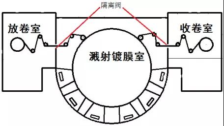 目前柔性透明導(dǎo)電薄膜沉積技術(shù)已經(jīng)在觸摸屏行業(yè)普遍推廣,柔性透明導(dǎo)電膜通過卷繞鍍膜設(shè)備鍍制,柔性透明導(dǎo)電薄膜基材都是PET(Polyethylene terephthalate,聚對(duì)苯二甲酸乙二醇酯)等柔性材料。為攻克柔性卷繞鍍膜中生產(chǎn)完一卷膜后全部破真空產(chǎn)能低的難題,在柔性卷繞鍍膜設(shè)備放卷室和工藝真空室、收卷室和工藝真空室之間各增加一個(gè)隔離閥,這樣在生產(chǎn)完一卷膜材后只需對(duì)放卷室和收卷室進(jìn)行破真空處理,縮減了工藝真空室的抽氣時(shí)間,提高生產(chǎn)產(chǎn)能。