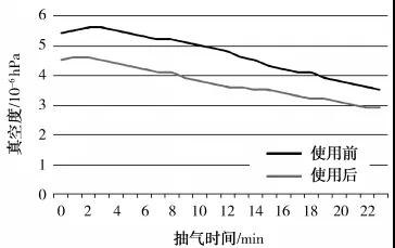 (2)收、放卷室換卷后抽氣時(shí)真空變化,隔離閥使用前后,收、放卷室換卷后抽氣時(shí),濺射鍍膜室的真空變化見圖4。