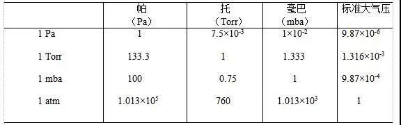 “毫米汞柱(mmHg)”是通過(guò)直接度量長(zhǎng)度來(lái)獲得真空的大小的。尤其在使用托里拆利氣壓計(jì)時(shí),把毫米用作壓力測(cè)量則更為直觀。但是1958年,為了紀(jì)念托里拆利,用“托(Torr)”代替了毫米汞柱。1托就是指在標(biāo)準(zhǔn)狀態(tài)下,1毫米汞柱對(duì)單位面積上的壓力,表示為1Torr = 1mmHg。1971年國(guó)際計(jì)量會(huì)議正式確定“帕斯卡”作為氣體壓強(qiáng)的國(guó)際單位,1Pa = 1 N/m2 ≈ 7.5×10-3Torr。表1-1給出了目前真空技術(shù)中常用的壓強(qiáng)單位及其之間的換算關(guān)系。