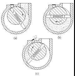 圖1-1所示,旋片2把泵腔分成了A、B兩部分,當(dāng)旋片沿圖中給出的方向進(jìn)行旋轉(zhuǎn)時(shí),由于旋片1后的空間壓強(qiáng)小于進(jìn)氣口的壓強(qiáng),所以氣體通過(guò)進(jìn)氣口,吸進(jìn)氣體,如圖1-2(a)所示;圖1-2(b)表示吸氣截止。此時(shí),泵的吸氣量達(dá)到上限,氣體開(kāi)始?jí)嚎s;當(dāng)旋片繼續(xù)運(yùn)動(dòng)到1-2(c)所示的位置時(shí),氣體壓縮使旋片1后的空間壓強(qiáng)增高,當(dāng)壓強(qiáng)高于1個(gè)大氣壓時(shí),氣體推開(kāi)排氣閥門(mén)排出氣體;繼續(xù)運(yùn)動(dòng),旋片重新回到圖1-1所示的位置,排氣結(jié)束,并重新開(kāi)始下一個(gè)吸氣、排氣循環(huán)。單級(jí)旋片泵的極限真空可以達(dá)到1Pa,而雙級(jí)旋片泵的極限真空可以達(dá)到10-2Pa數(shù)量級(jí)。