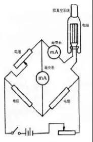式中Q1是燈絲輻射的熱量,與燈絲的溫度有關(guān);Q2是氣體分子碰撞燈絲而帶走的熱量,大小與氣體的壓強(qiáng)有關(guān)。當(dāng)熱絲溫度恒定時(shí),Q1是恒量,即熱絲輻射的熱量不變。在某一恒定的加熱熱絲電流條件下,當(dāng)真空系統(tǒng)的壓強(qiáng)降低,即空間中氣體的分子數(shù)減少時(shí),Q2將隨之降低,此時(shí)燈絲所產(chǎn)生的熱量將相對(duì)增加,則燈絲的溫度上升,燈絲的電阻將增大,真空室的壓強(qiáng)和燈絲電阻之間的存在這樣的關(guān)系P↓→ R↑,所以可以利用測(cè)量燈絲的電阻值來(lái)間接地確定壓強(qiáng)。