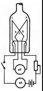 圖1-6為熱偶真空計(jì)的結(jié)構(gòu)示意圖。熱偶真空計(jì)的規(guī)管主要由加熱燈絲C與D(鉑絲)和用來(lái)測(cè)量熱絲溫度的熱電偶A與B(鉑銠或康銅-鎳鉻)組成。熱電偶熱端接熱絲,冷端接儀器中的毫伏計(jì),從毫伏計(jì)中可以測(cè)出熱偶電動(dòng)勢(shì)。測(cè)量時(shí),熱偶規(guī)管接入被測(cè)真空系統(tǒng),熱絲通以恒定的電流,同電阻真空計(jì)不相同的是,此時(shí)燈絲所產(chǎn)生的熱量Q有一部分將在燈絲與熱偶絲之間傳導(dǎo)散去。當(dāng)氣體的壓強(qiáng)降低時(shí),熱電偶接點(diǎn)處溫度將隨熱絲溫度的升高而增大,同樣,熱電偶冷端的溫差電動(dòng)勢(shì)也將增大,及氣體壓強(qiáng)和熱電偶的電動(dòng)勢(shì)之間存在這樣的關(guān)系:P↓→ ε↑。