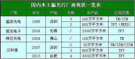 目前,國(guó)內(nèi)仍以批量生產(chǎn)TN 和STN 型偏光片產(chǎn)品為主,只有盛波光電、三利譜等幾家配套生產(chǎn)TFT 液晶面板用偏光片。