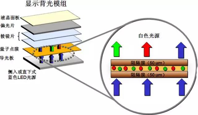 量子點(diǎn)薄膜是一層嵌入了由磷化銦和鎘組成的納米尺寸球狀量子點(diǎn),可以把大約三分之二由背光源發(fā)出的藍(lán)色光轉(zhuǎn)化為純的紅光和綠光的高分子膜。