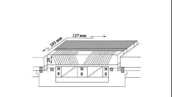 c、一種間隙型刻槽改進靶材(圖二)。該靶所用的陰極是平面磁控濺射型的。靶磁場由置于靶的銅背板下方的水冷卻的永磁體產(chǎn)生。在兩個磁極之間的中心位置處和不帶靶材的陰極表面上,其磁場強度為0.145 T。靶材可以為鐵、鎳等導磁材料,將靶材粘在銅背板上以后,用專業(yè)刀具在靶材上沿其寬度方向切出所要求的間隙。其原理是在靶材表面上切出許多截斷磁路的間隙,使得在靶材尚未達到磁飽和的條件下,通過控制間隙寬度和間隙的間隔,即可在磁性材料靶表面上產(chǎn)生均勻的,較大的漏泄磁場。從而使靶材表面上能夠形成正交磁場,而達到磁性材料的高速磁控濺射成膜的目的,這種磁系統(tǒng)可以允許磁性靶材的厚度超過20 mm。